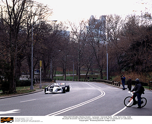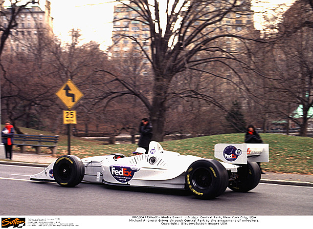 These are the people behind this PR stunt involving a '97 Lola painted in the colors of the new series sponsor FedEX. Michael Andretti was at hand to pilot this vehicle though the park. One wonders if the tires ever got up to operating temperatures... |