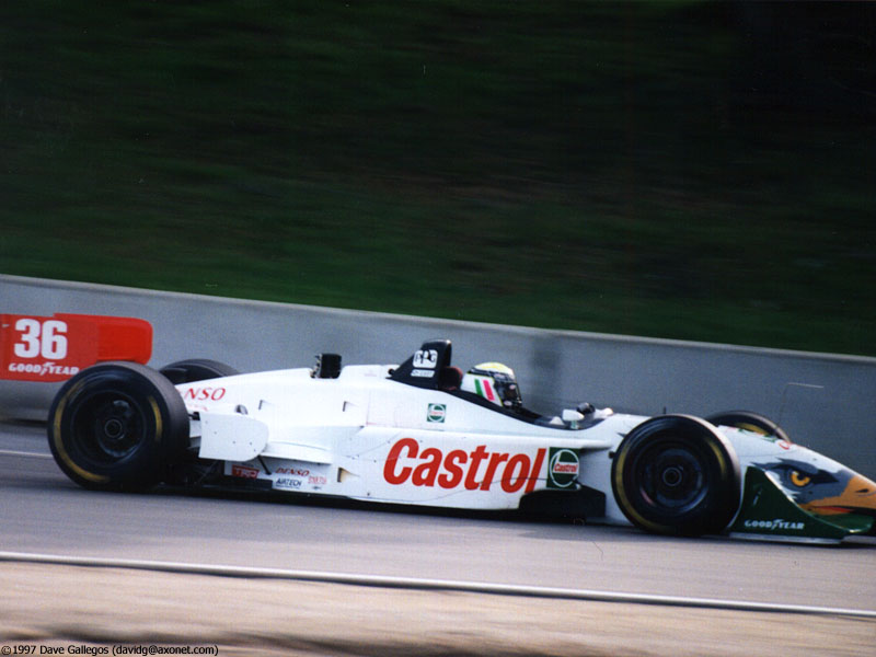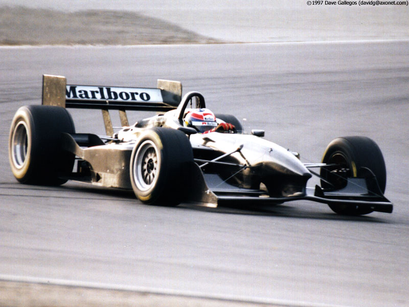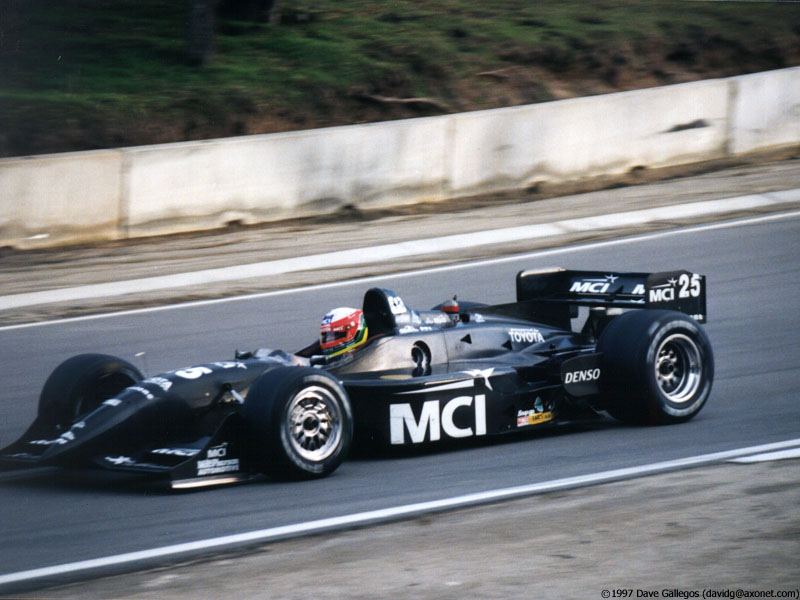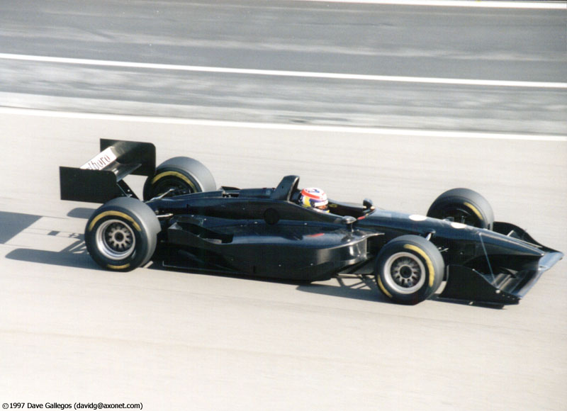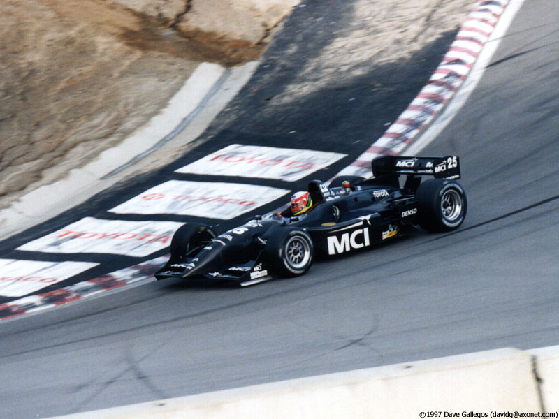 If you've attended races here, or you've seen the TV coverage,you know that Laguna Seca is nestled in the golden hills of theMonterey area. What you never see at a Laguna Indy race is greengrass, 'cause the race takes place in September, well after the grasshas dried up for the summer. Normally the drivers stay away from each other because they'rebusy testing and not competing with each other. However at one pointAlex came out of the pits just after Mike, and for several laps hetried to keep up; a good test for a new guy with very few laps inhyper-G machinery. After several laps Alex lost some ground to Mike,but I was impressed that he was hanging as well as he did. However,considering his Toyota power, there are several possibleexplanations: 1) Alex is a reeeally fast driver; 2) Fangio pulled aRahal and got out just as a Japanese engine company found power; 3)Mike was testing the rumored Goodyear 500-mile "economy" tire forteams with tight budgets; 4) Mike was busy testing and not trying tooutrun the young punk.