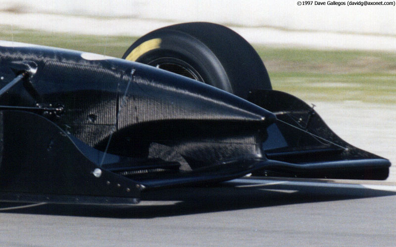 ©1997 SpeedCenter Internet Publishing, Inc. By Dave Gallegos (davidg@axonet.com) Click on images to download larger pix Unlike the search for Nicole's "real killers," you can easilyfind real race fans 'cause we're the ones who take a day off work anddrive 70 miles just to see some guys practice driving theirIndy..err..Champ cars. Four CART teams scheduled a three-day test atLaguna Seca for December 16-18, so at the last minute (Tuesdayafternoon) I told my boss that I needed to take Wednesday off. Apparently there are only about 20 real race fans in the Bay Areabecause that's about how many people were scattered around the trackall day. Just an intimate gathering with Mike and Al zooming aroundthe track, and with me and a few other wannabes standing aroundwondering why our dads didn't give us a Skip Barber 3-day race coursefor our 16th birthday to help us start our racing careers. This early in the pre-season is a prime opportunity to getunusual pictures, and it certainly paid off with early looks at a newunpainted '98 Reynard and the radical new '98 Penske. In fact, allof the pictures here could not have been taken on a race weekend. Some pictures are obvious (unpainted bodies), but others are moresubtle; try to guess why each picture must have come from a non-raceevent before reading the description.