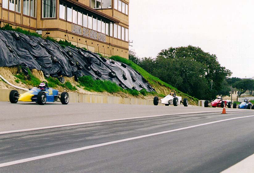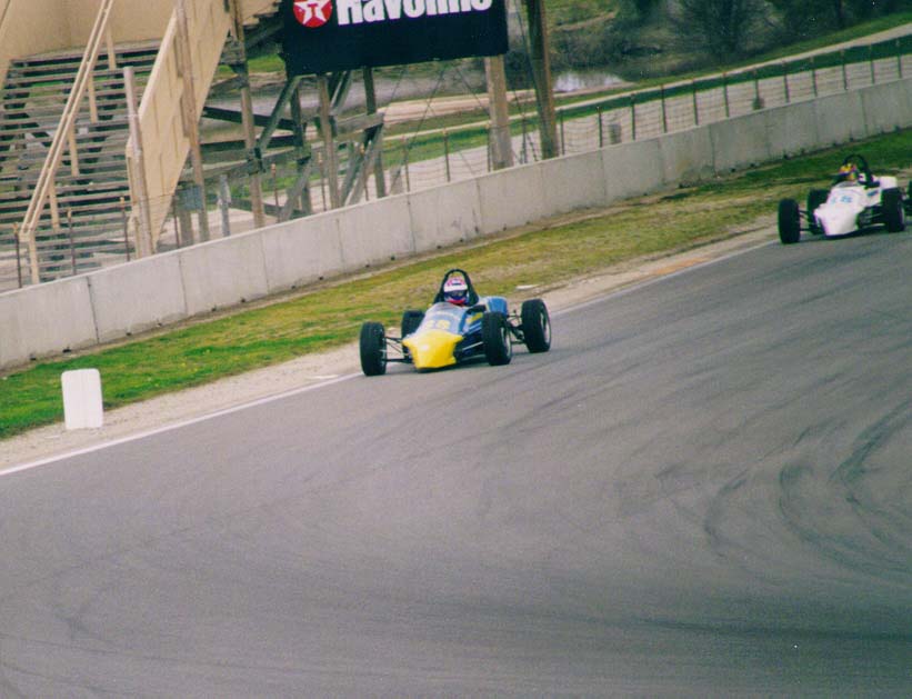 After all the races are done, they have a "free-for-all" no-points race that anyone can enter called a memorial race. There are always a few instructors joining in this race. Usually, I never run memorial races because I don't want to assume any unnecessary risks and chance car damage. But, in last months article I said at the very end how I really took a look at and scrutinized my racing program, and how I was going to make some changes. Well, one of these changes is running memorial races. I want to get as much experience dicing and swapping positions as I can, and since the instructors race in memorials, it's a great opportunity. The start of the race was inverted, meaning the fastest guys start in back. I had to start this race in a different unfamiliar car because the clutch master cylinder blew up on the car I won in, and the mechanics took it back for repairs. This was going to be interesting. Along with me sticking out in the memorial race was Roger Yasukawa (the fast guy I raced at Phoenix, who's been racing in England and is over here during the "off-season") and Mike Morris (another top competitor). Both, along with me, haven't done any memorial races this season. From the instructor side, Tom Woods (who's racing the Barber Dodge Pro series this year) and Mark Hamilton Peters (one of the head instructors and former Vauxhall winner) were going to put their hat into the ring. MHP does most the memorials, and was probably favored to win since he has won the last two. Unknown to us at the time, the other instructors and staff were making wagers on who would win! On the start, it was mayhem! A good mayhem though - everyone was clean, but we were going 3 wide over the front straight and into turn 2. Wow, this was wild! I had to back off the gas quite a bit, but I made a couple positions going around the outside of turn 2. After the field straightened out, we were cooking, and I was probably in something like 5th. A lap later, I see Roger in my mirrors right on my tail. The next lap he tried to make a pass under me in the corkscrew, but I wouldn't have any of that. We went down the corkscrew side by side, but I had a better drive and kept my position. Then, he took a look in T9, but I held the outside line solid and won that battle. However, on the next lap, I didn't drive a defensive enough line and Roger got right under me going into T9. We went side by side and going into T10, he had the advantage, and I tucked in behind him. "That's cool," I thought, "I'll follow Roger around a bit and play." On the next lap though, Roger was able to put a slower car between us (from the inverted start) at the corkscrew. Darn, this gave him a comfy second gap between us. Just when I think I can go into "hot pursuit" mode, I look in my mirror to see MHP very close. One guy passed me, I'd be damned if I were going to let another one by :-)! This was the start of the best dicing and racing I have ever had! MHP was on my tail for the next few laps, and we were going side by side at every possibility! He was a little better than I was off turn 4, so I'd protect the inside line, and he'd take the outside. We'd go through turn 5 side by side and then up to turn 6. We were side by side on the entry of T6, neither of us backing off until the very end - a serious game of chicken. Since I had the inside line, MHP would back out at the last possible second, and we would both slam on the brakes and go sideways through T6, a little slower than normal. That scenario happened just about ever lap. He also tried to make a move in T9 a couple times, and we went side by side both times, tires screaming in protest, cars sideways, but I held the outside line and had the advantage going into T10.
