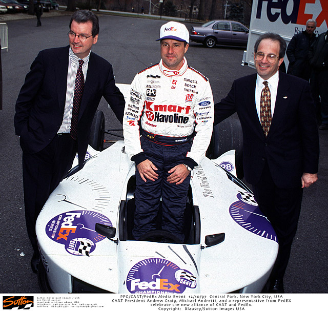 These are the people behind this PR stunt involving a '97 Lola painted in the colors of the new series sponsor FedEX. Michael Andretti was at hand to pilot this vehicle though the park. One wonders if the tires ever got up to operating temperatures... |