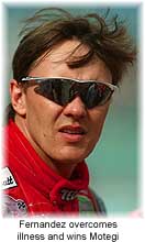 Early in the race, it seemed as if Jimmy Vasser and Michael Andretti would have something to say about the outcome, but both drivers dropped back due to costly mistakes. Andretti’s crew miscalculated his fuel load, costing him several laps after a very slow return to the pits without engine power. Vasser stayed with the leaders until his car’s engine stalled during the last pit stop. It took almost one minute to complete the stop and get the engine refired. Gil de Ferran finished third, benefiting from Vasser’s pit problems. He was among several drivers to lead a few laps in a race that saw just 3 yellow flags over a 500km distance. Bobby Rahal, who said his car ran "on rails" in turn one and two ended a very promising performance with a spectacular crash when his right front wheel bearing seized, sending his car off these "rails" straight against the outside retaining wall at the exit of turn 2. The car flipped when it got sideways at high speed, slid across the track and made contact with the inside wall, with the car still on its side. While the accident looked very frightening, Rahal escaped uninjured. This final caution of the race left the leaders with a five-lap dash to the finish. Al Unser Jr. tried what he called his only chance to pass Fernandez going into turn 1 right after the green came out. Fernandez hugged the inside line, while Unser lacked momentum to complete a pass on the outside. After this attempt, Fernandez extended his lead over Unser before taking the checkered flag. Further back in the pack was some late race contact sport to be witnessed: Tracy and Moore traded positions twice and even made contact once while fighting over fourth place. This win marks the first win on an oval for Fernandez and the second win of his career. His first win came in Toronto in 1996, a race overshadowed by the tragic deaths of Jeff Krosnoff and a race marshal Gary Avrin. At Motegi, Fernandez can finally celebrate a win the way most drivers enjoy their first victory. Although not on top of the podium, Al Unser Jr. felt like a winner. The race was his first since the 1996 season in which he led some laps. But it was mostly the way he was able to charge through the field from a midfield grid position to the lead, which explains his post race exuberance. The new Penske chassis seems to be a very competitive design, something that can’t be said about the previous two models. Andre Ribeiro also ran well, but had trouble early in the race when slight contact forced him to stop under green and replace his car’s nose cone. Penske is the team to watch – it seems like they just need to relearn how to win races to be dangerous. Al Unser used to be the "King of Long Beach" – if the new car is as good on street courses as it is on medium sized ovals, he may just be able to again live up to that title when CART returns there next week. While Tony Kanaan impressed with fast practice speeds and a solid sixth place finish, giving him the lead in Rookie of the Year points, PacWest drivers Blundell and Gugelmin would rather want to forget the weekend. They were running well behind their 1997 performance level. Their gamble to use last season’s chassis and engine until the ’98 Mercedes was totally debugged seems to have backfired, given that Greg Moore is now tied for the points lead driving exactly the package Pacwest thought wouldn’t be ready for prime time. Long Beach may be a track where detailed setup information from 1997 combined with the 1997 package may give them some of the speed back they were lacking at the two new tracks that kicked off the 1998 FedEx Championship Series. The Lola driven by Arnd Meier showed dramatic progress since Homestead, showing that every mile they get with the car is needed to learn the limits of it. Meier practiced faster than Jones, Barron and Matsushita, and finished in a respectable 15th position, 6 laps down, which is less than half the number of laps he lost at Homestead in a shorter race. Long Beach will be a tough test for the car: Meier never drove there before, and road track testing of the Lola was very minimal so far. Elsewhere in the paddock the mood must be brightening, too: Team Kool Green has two cars in the top ten at Motegi. Dario Franchitti finished 8th, his best CART finish ever, and Paul Tracy even got to lead a few laps. The team seems to be learning how to work together quickly. Department Most Impressive Performance: Gualter Salles returned to CART, filling in for the injured Dennis Vitolo. He didn't waste much time and put the #34 Payton-Coyne machine on the starting grid in front of Michael Andretti, and finished the race in 12th place. So far Payton-Cyone had been unable to put together a decent car for Michel Jourdain, and Dennis Vitolo didn't finish at Homestead due to his broken finger. Still, the ride is currently only a one-off for the Brazilian. Vitolo is expected back at the wheel of #34 in Long Beach. And what happened to the champion? Alex Zanardi had a good racecar in the first half of the race, but in lap 119 he touched the wall in turn 2, damaging his suspension that then broke in turn 3, sending his car into the wall. Next week he will try to defend his win at Long Beach in ‘97. Given his road and street course record, he should be able to collect some points he missed at Motegi. Rumors at the track mention that this may be the last CART season for Zanardi who may be headed to Formula One when his contract with Chip Ganassi expires. Can he bag another title before he heads to the grooved tires? Some words about the track and the event at Motegi: The drivers loved the smooth pavement, and the 55,000 fans saw a good, although not extremely exciting oval race. It is possible that the wide track is responsible for the many clean [and unexciting] passes. Traffic is what usually makes ovals exciting for the audience, but with the amount of space available at Motegi, the type of moves the crowd gets excited about a